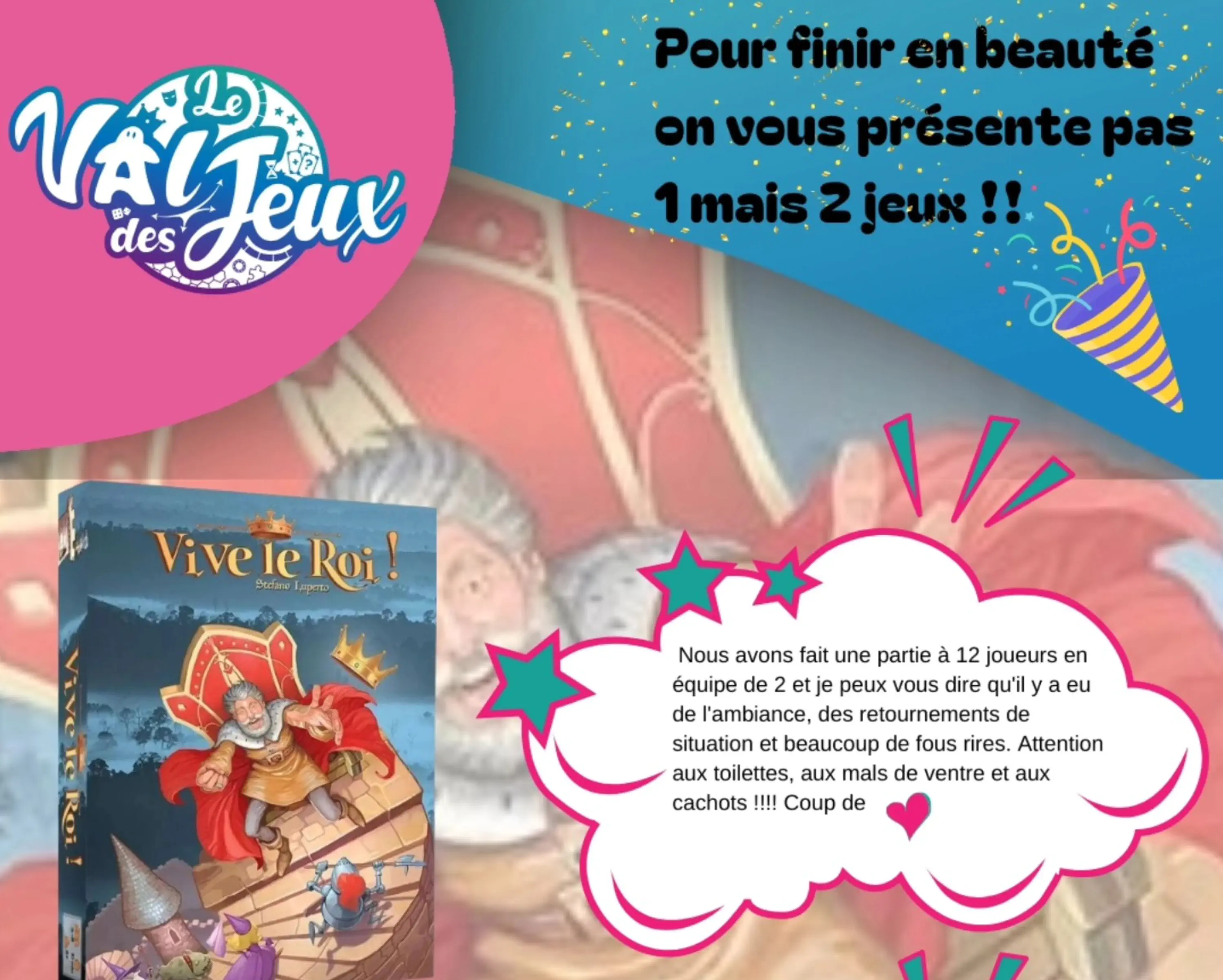 On en parle… https://www.youtube.com/watch?v=AKtx-jiPkMY&t=7603s Penelope gaming (12/02/25)   Penelope, elle, sait déjà…Tout ce qu’elle dit est très exact, et on sent qu’elle a fait pas mal de parties :) Et oui, pour le visuel de boîte, je regrette un peu comme elle le visuel d’origine. Et oui ! Alors pourquoi ? Ah, c’est difficile, et un peu triste, j’expliquerai tout ça plus tard… Bon, mais quand elle aura eu en main tout le vrai reboot 2025, j’ai confiance, elle devrait être conquise.Et peu importe : élue Reine à l’unanimité ! Rue du jeu (10/02/25)   Ah, mais ils ne savent pas que le reboot 2025 arrive dans quelques jours ! Avec un nouveau design, des trucs en plus, le même fun : on va les informer :)Mais c’est trop gentil ce qu’il disent…Pas de guillotine et tous Rois !     (pour Vive le Roi, aller à 25:00)   https://youtu.be/wOtLOSnkKg0?t=1524&si=J5G_U-PJeFsYmv1B  Paradoxe temporel, oui… mais non ! Car Benjamin Guimbert a eu la chance de recevoir le reboot 2025 juste à temps. Distorsion de livraison chinoise ?En tout cas, 80% de note finale pour le jeu  c’est un très bon résultat d’élection ! Quasi dictatorial, d’accord, mais là, on aime bien :) Vive le Roi Benjamin !   Paradoxetemporel (15/02/25) Le Meeple jaune (17/02/25)   Amélie alias le Meeple Jaune vous livre toutes ses impressions, avec une vision très détaillée des mécanismes du jeu et de leurs implications.Elle aussi apprécie le jeu lui-même, sa simplicité, et ses finesses. Bref, du bon !Mais tiens, elle non plus n’aime guère le graphisme ? Ah, mais si elle avait raison ?! Peu importe ! On vote à l’unanimité pour Amélie sur le trône de la Reine  ! Au Meeple Reporter (24/02/25)   Le Tintin du jeu s’aventure dans le Château… Une plongée détaillée dans le passé et le présent du jeu qui fait honneur à notre reboot 2025 ! Penelope live (06/03/25)   Penelope again, live sur Twitch. Avec cette fois la boîte du Vive le Roi 2025 que nous avons glissée dans son sac à Cannes…Une super présentation, avec une vraie partie à deux un peu baroque et trop sympa.Si on réédite encore Vive le Roi, on ajoutera un personnage P pour Penelope ! Juré !