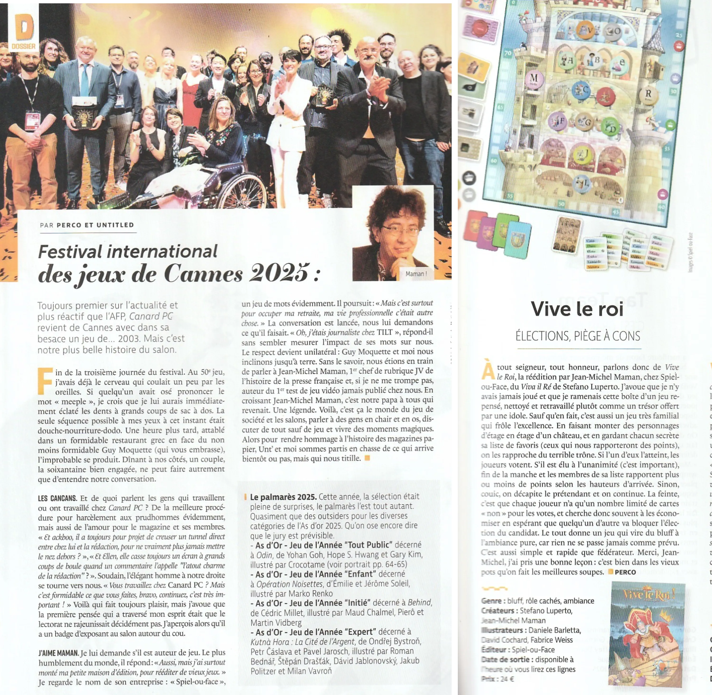 Au Meeple Reporter (24/02/25)   Le Tintin du jeu s’aventure dans le Château… Une plongée détaillée dans le passé et le présent du jeu qui fait honneur à notre reboot 2025 ! Penelope live (06/03/25)   Penelope again, live sur Twitch. Avec cette fois la boîte du Vive le Roi 2025 que nous avons glissée dans son sac à Cannes…Une super présentation, avec une vraie partie à deux un peu baroque et trop sympa.Si on réédite encore Vive le Roi, on ajoutera un personnage P pour Penelope ! Juré ! Boris Krywicki (ruedujeu)   Boris aime beaucoup le fun et la simplicité de Vive le Roi ! Merci de cet enthousiasme, et un personnage K dans Vive le Roi 2038, c’est voté. Au fait, le jeu est ancien, certes, mais quand même moins que son ré-éditeur…  Eh oui, tout est parti d’une rencontre aléatoire dans un restaurant grec surbondé après la sortie du Festival de Cannes. Honte à moi : je ne savais pas que le légendaire et historique Canard PC existait toujours ! Une rencontre merveilleuse en tout cas avec Perco et Untitled, et un rappel du bon vieux temps (qui n’est pas meilleur qu’aujourd’hui). Merci pour cette review et cet hommage très excessif mais sympa.   Canard PC jeux de plateau  Paradoxe temporel, oui… mais non ! Le Reboot 2025 de Vive le Roi est dans le présent !80% de note finale pour le jeu  c’est un très bon résultat d’élection ! Quasi dictatorial, d’accord, mais là, on aime bien :) Vive le Roi Benjamin !   Paradoxetemporel (15/02/25)